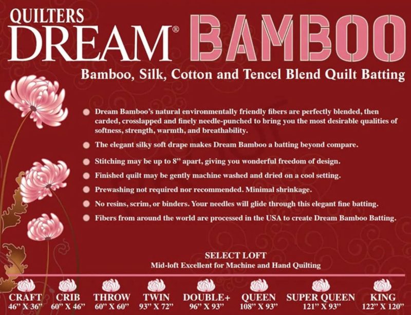 Dream Bamboo’s natural environmentally friendly fibers are blended, carded, crosslapped and finely needle punched to bring you unparalleled softness, strength, warmth and breathability. The luscious silky soft drape makes Dream Bamboo a quilt batting beyond compare!