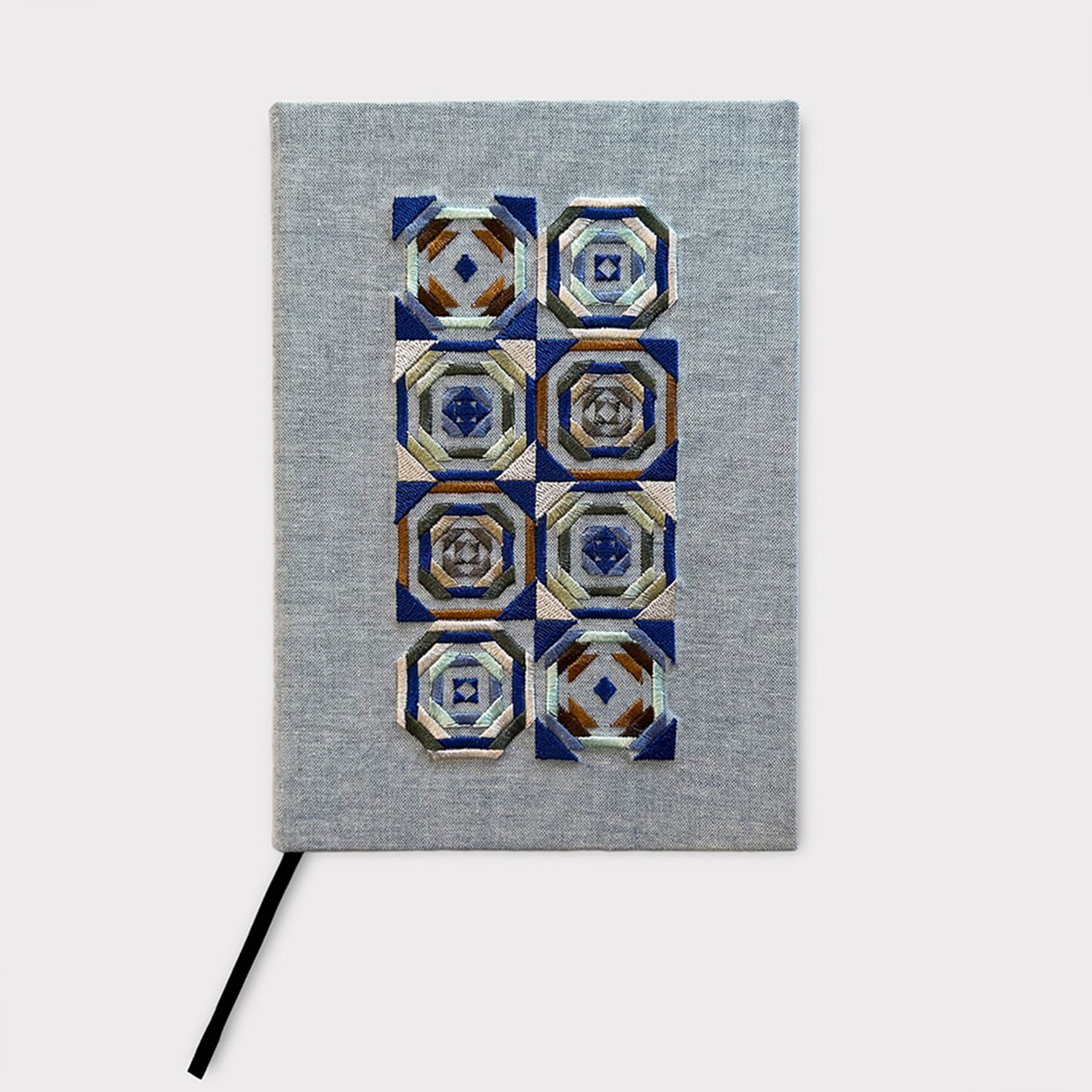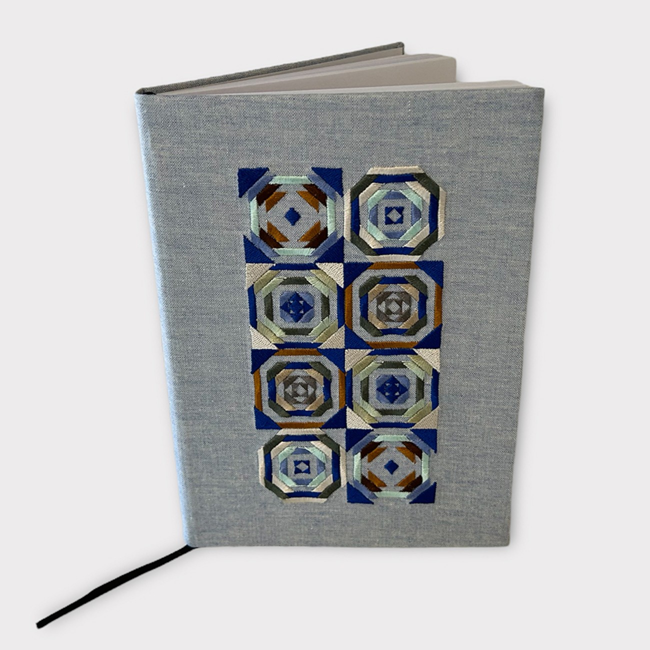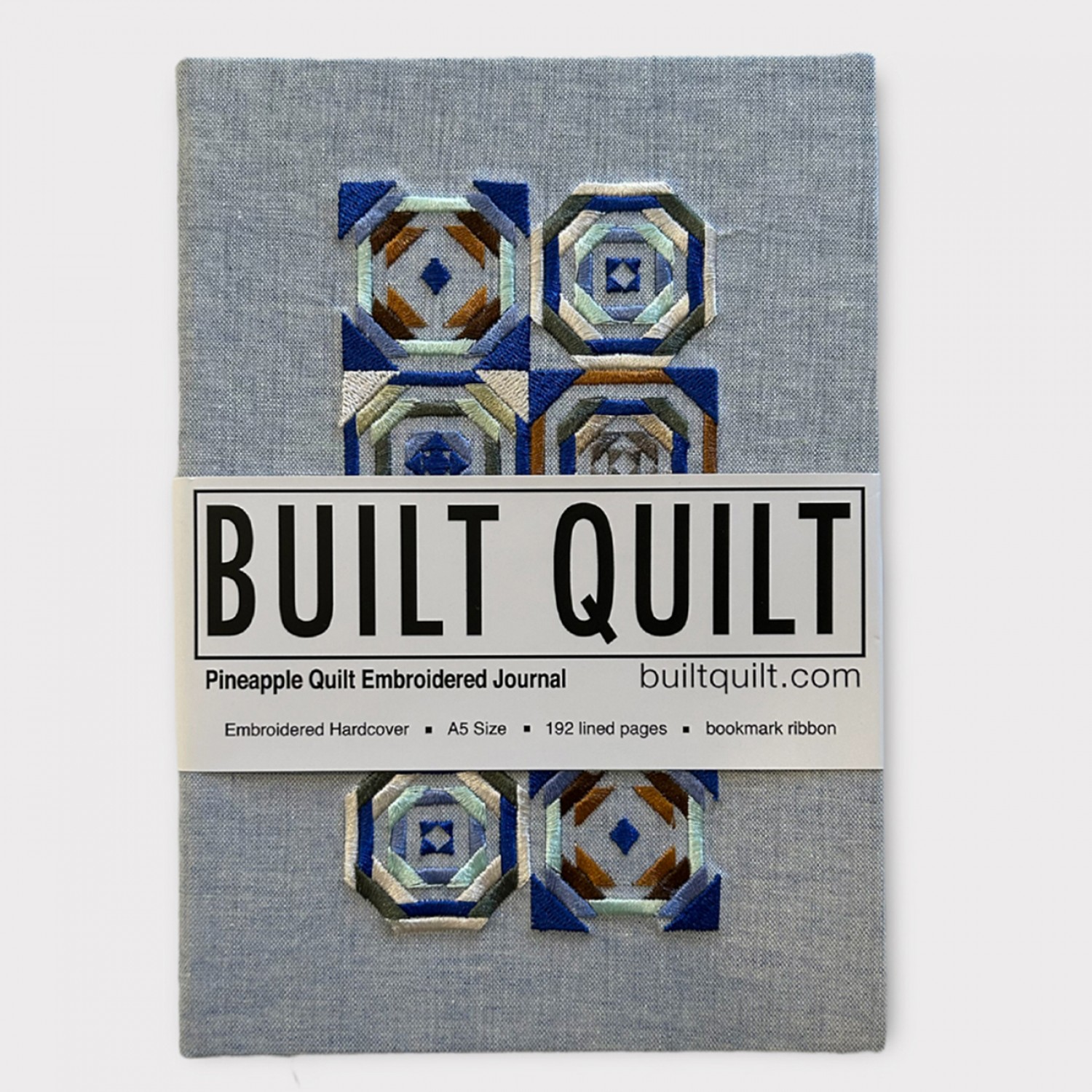 Denim blue hardcover journal featuring the beloved Pineapple quilt pattern embroidered on the cover. A5 in size, it consists of 192 lined pages perfect to use as a diary, journal, or handy notebook for ideas. Includes bookmark ribbon. Makes a perfect gift!