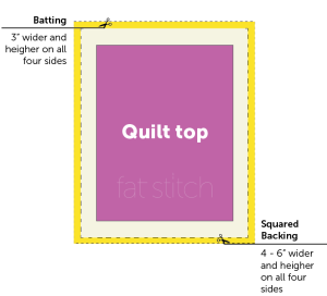 Add in the width of your quilt a minimum of 6 inches to calculate how much batting you need for longarm quilting. See example below showing you will need a minimum of three additional inches on all four sides of your quilt top. See our blog for a more in-depth guide on how to prep for longarm machine quilting services to save on costs.