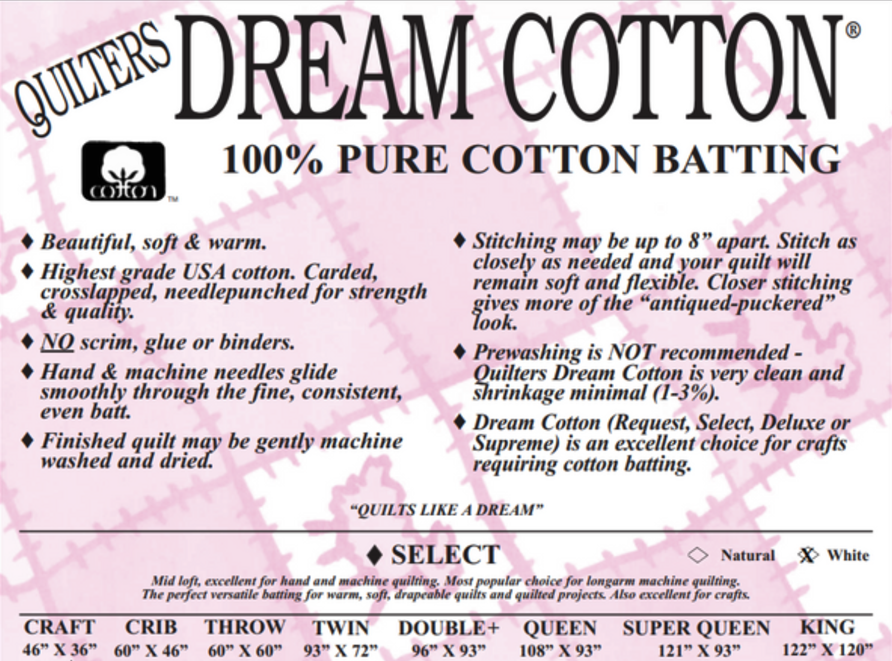 Bamboo is a natural fiber made from renewable resources. It is durable, has antibacterial properties, and breathable making it lovely for the skin. It has a nice drap and is lighter than cotton. This batting is needle punched with no scrim with an antibacterial green manufacturing process. The 6 oz. gives the quilt loft and weight to show off the quilting. Winline recommend machine or hand quilt approximately 4″ apart. 3-5% shrinkage. No need for pre-washing.