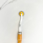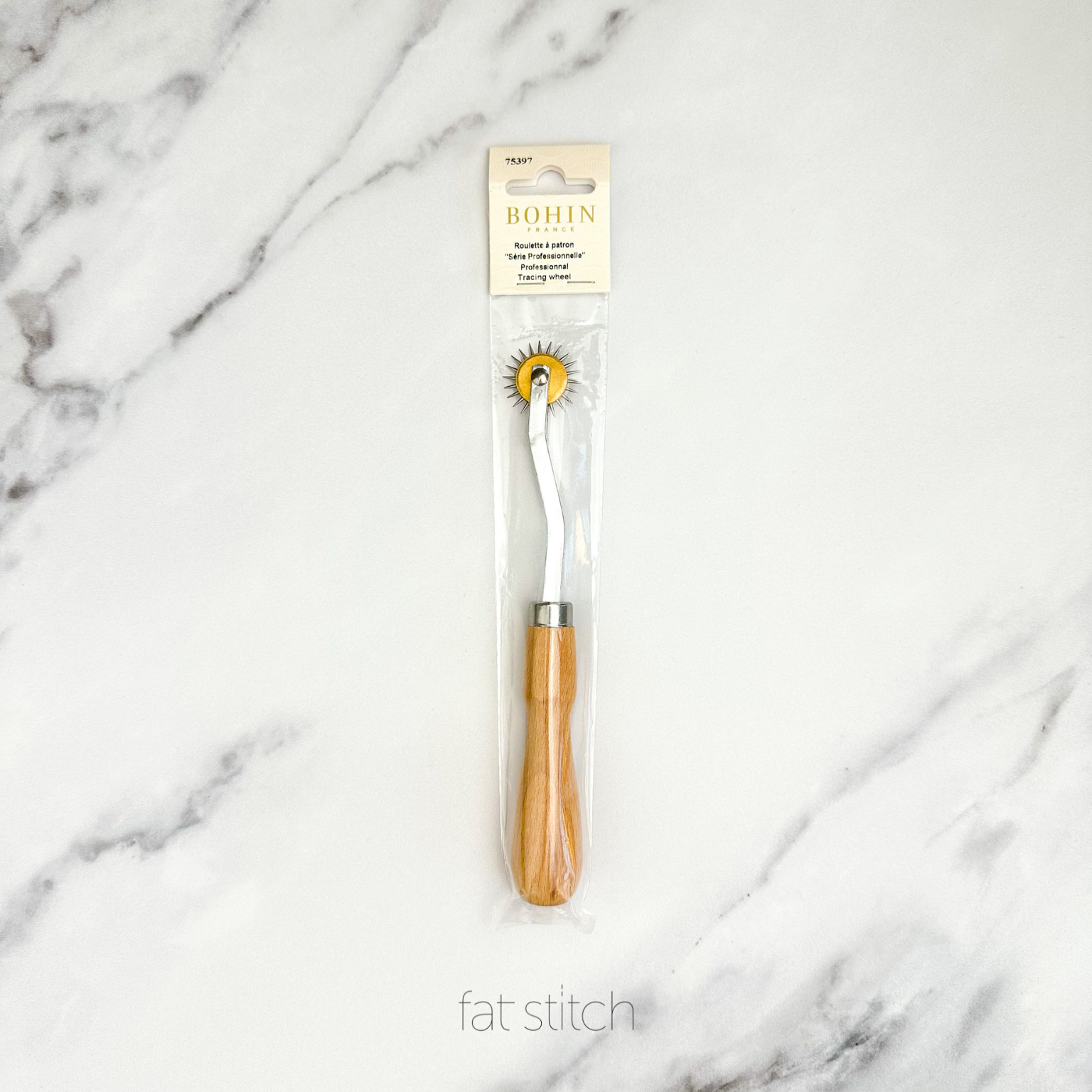 This professional grade tracing wheel has an oak handle for comfort and longevity. Used to transfer markings from patterns onto fabric with or without tracing paper. This tool also makes slotted perforations. Extremely sharp.