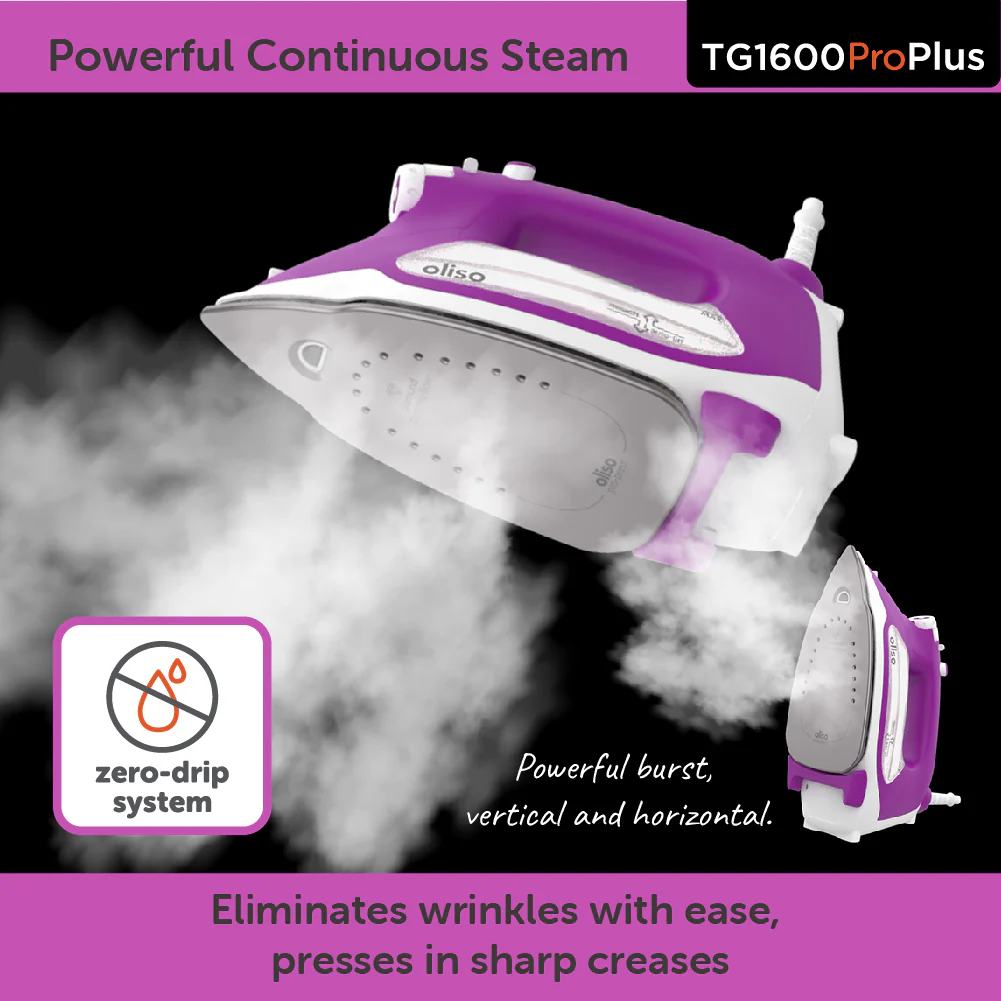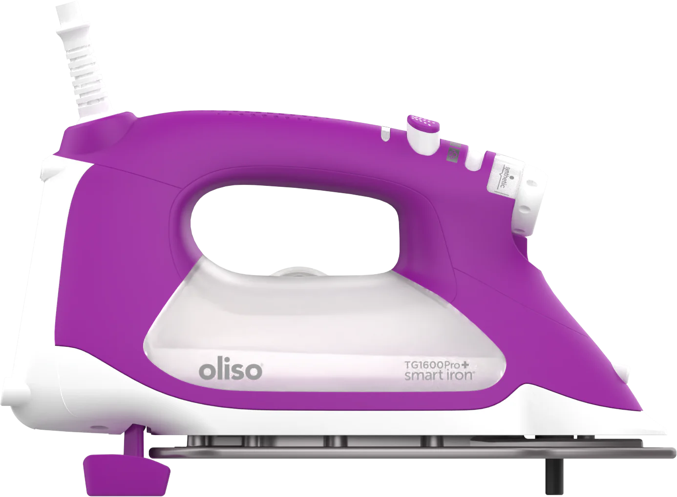 The new TG1600 Pro Plus ups its IQ with a new diamond ceramic-flow™ soleplate glides effortlessly over all fabrics types, further enhances its even heat distribution and provides quick and easy clean up when using fusibles. Rapid response™ triple play® steam system makes the TG1600 Pro Plus steamier and hotter than ever! A new anti-scale system keeps the TG1600 Pro Plus working stronger and longer. And since customers asked: Oliso delivered even more ergonomic weight distribution and an enhanced auto-lift responsiveness system to complete the update!Features designed for Quilters and Sewists: - NEW enhanced iTouch® never-lift technology: lifts and lowers with the touch of your hand, preventing burns, saving your wrists, and saving time.