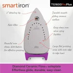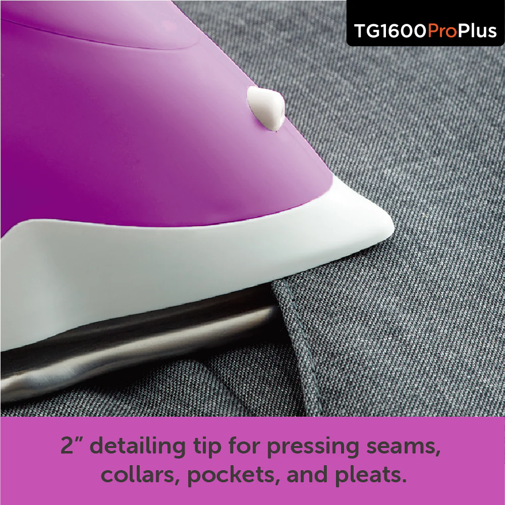 Other classic features include 1800 watts of power and horizontal or vertical bursts of steam. The TG1600 Pro Plus features a 30-minute extended auto-shut off for sewers and quilters, a 12.7 oz side fill tank, flat pressing surface, detailer tip, and a 12-foot cord for full range of motion.