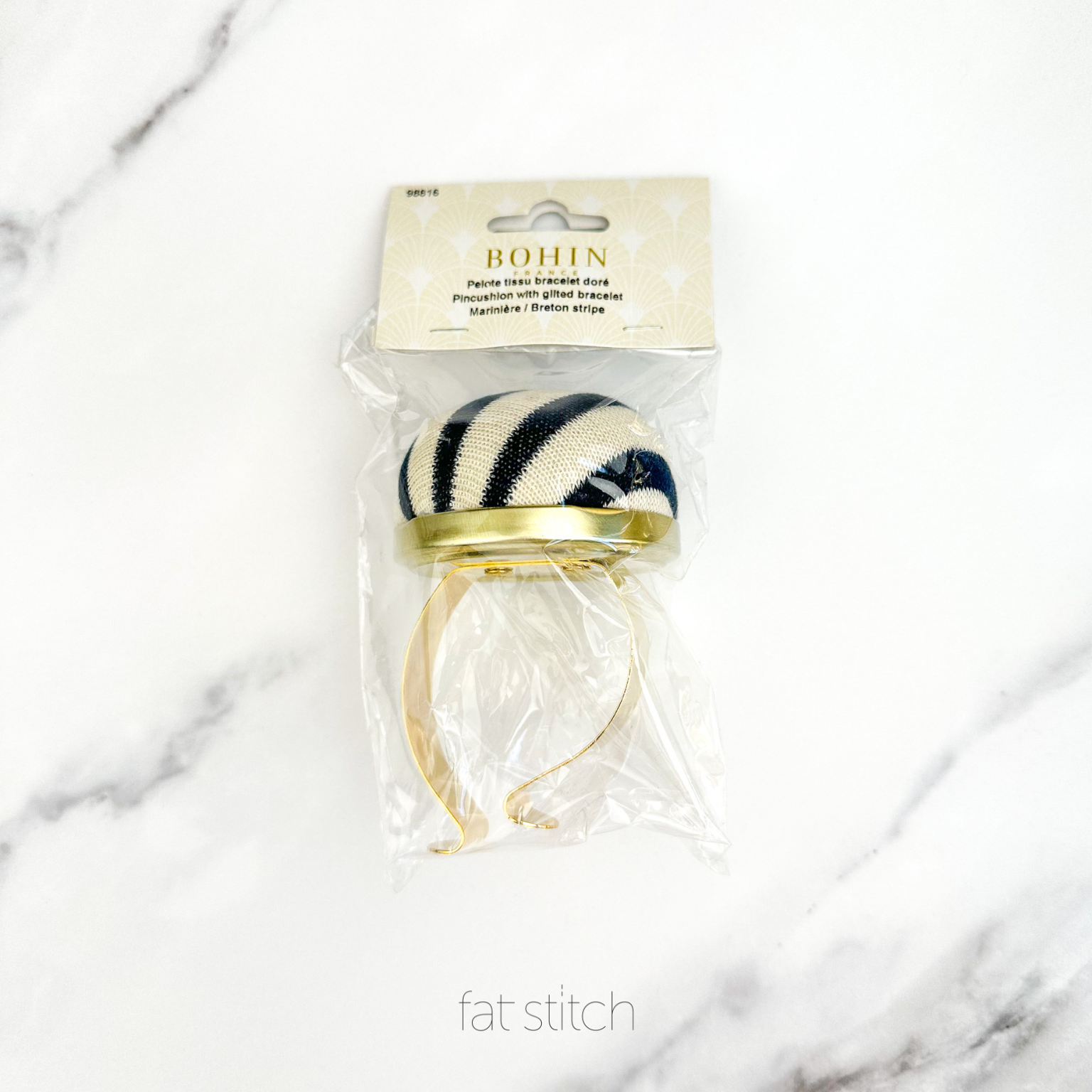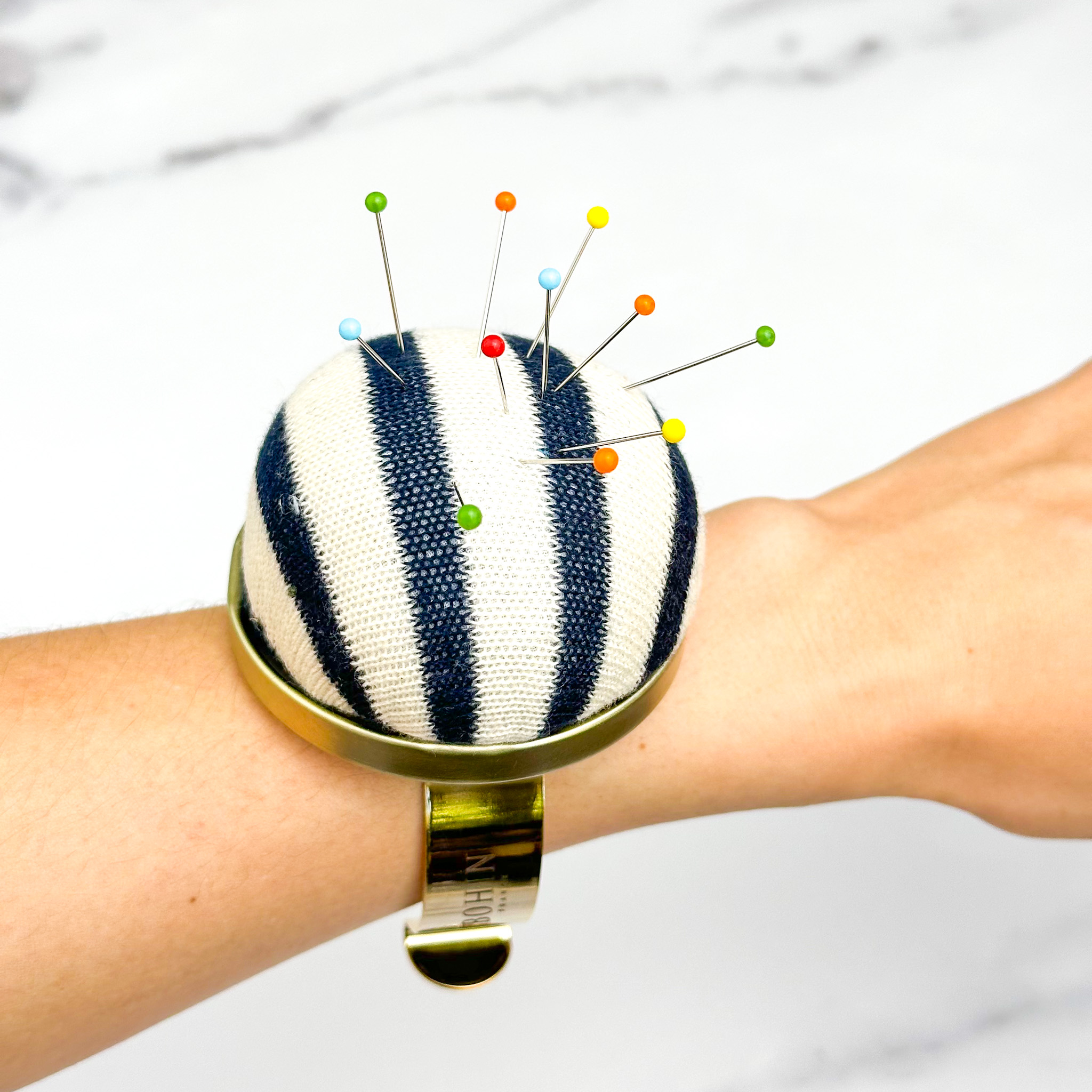 This large pincushion will fit comfortably on any wrist with the adjustable metal gold tone bracelet.