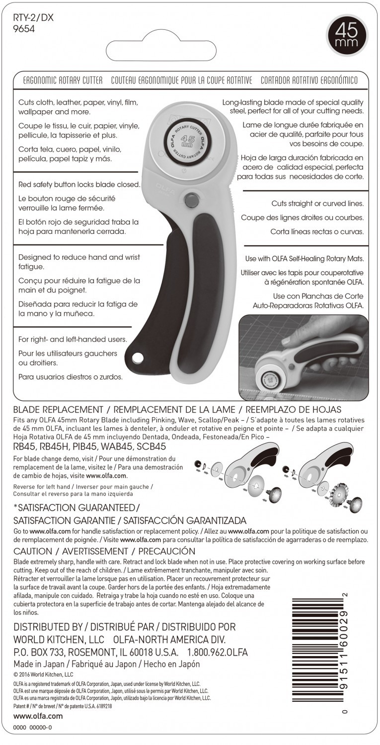 A rolling razor blade that’s perfect for all of your sewing and quilting needs. Sharp enough to cut through more than 6 layers of fabric, making quick work of your strip, block, and pattern cutting.Comfortable ergonomic handle reduces hand and wrist fatigue, and dual-action safety lock allows the blade to lock open for comfort and closed for safety. Blade is made of high quality tungsten carbide tool steel for unparalleled sharpness and superior edge retention. For right- and left-handed use. Good For: cutting cloth, fabric, paper, wallpaper, and leather.