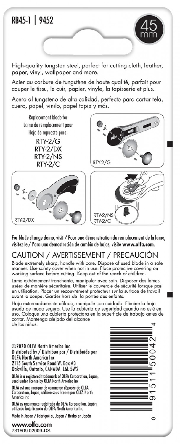 With one blade included in each pack, the Olfa RB45-1 is perfect for general quilting, sewing, and craft projects, and it can even be used in industrial applications. Made of sturdy metal, this rotary blade is built to last and will provide you with smooth, precise cuts for all your fabric-cutting needs.