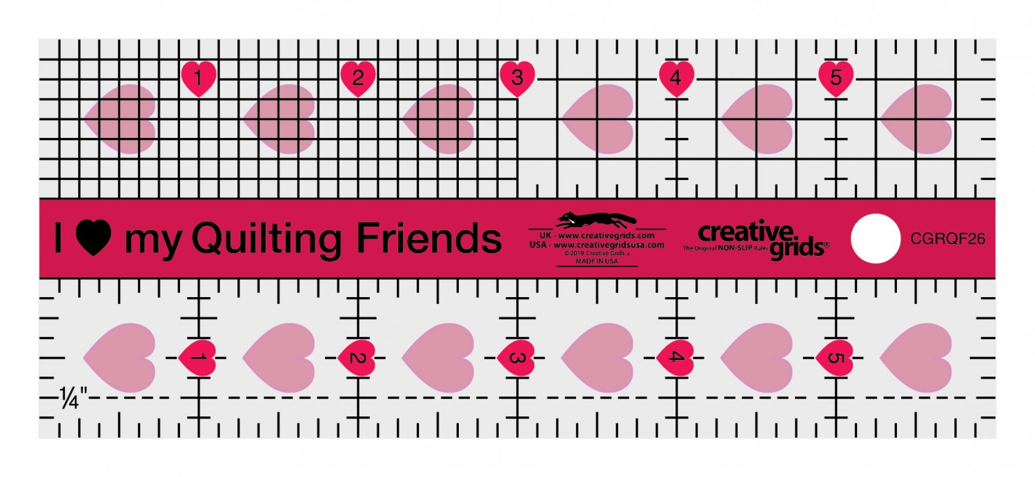 The ruler slides easily over the fabric until pressure is applied. Then, our exclusive gripper holds the fabric in place while cutting, eliminating slipping and miss-cuts! The I Love My Quilting Friends ruler is also available in a 2-1/2 x 10 inch size (Item CGRQF).