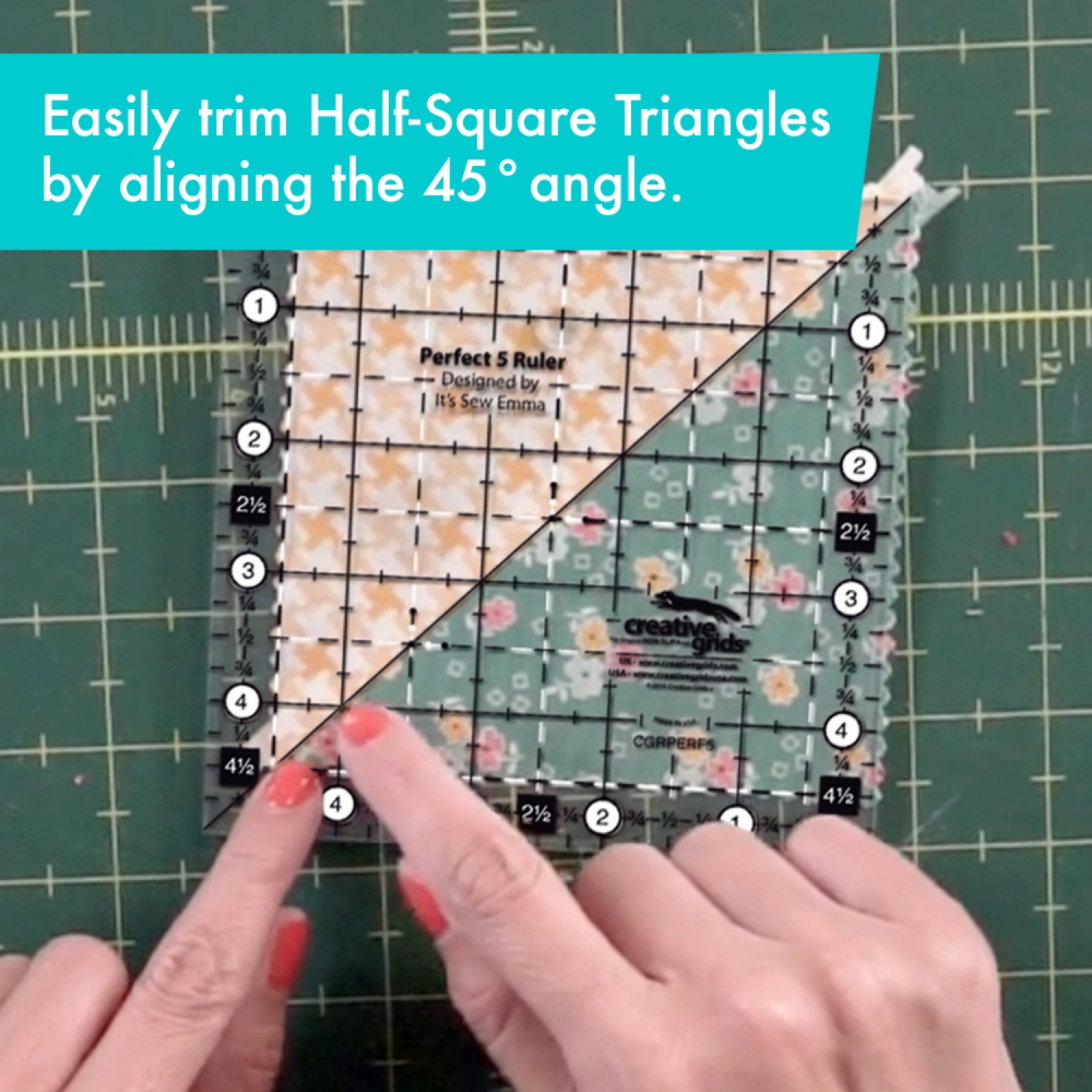 Cut an array of popular pre-cut shapes from a 5 inch square or from scraps. Or cut around the ruler to cut your own charms! The quarter inch grid covers the entire square. Popular cuts such as 2-1/2; 3-1/2, and 4-1/2 inch squares are highlighted. A diagonal line makes quick work of trimming half-square triangles. The Perfect 10 (Item CGRPERF10) features similar markings but is designed specifically for ten inch squares.