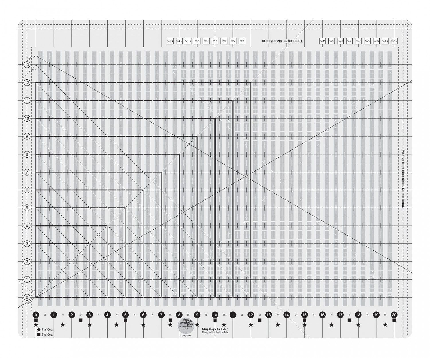 Reduce your rotary cutting time up to 75 percent with the Stripology® XL by Gudrun Erla. This slotted ruler has cutting slits every 1/2 inch so each strip you cut is the exact same size EVERY time! Cut an entire half yard of fabric or a fat quarter without ever moving the ruler. Follow the easy-to-read markings: squares for 2-1/2 inch cuts and stars for 1-1/2 inch cuts – no math required! Cut eight 2-1/2 inch or fourteen 1-1/2 inch strips at one time. Need to cut in 1/4 inch increments? No problem, just follow the chart included in the instructions and use the 1/4 inch line on the ruler.