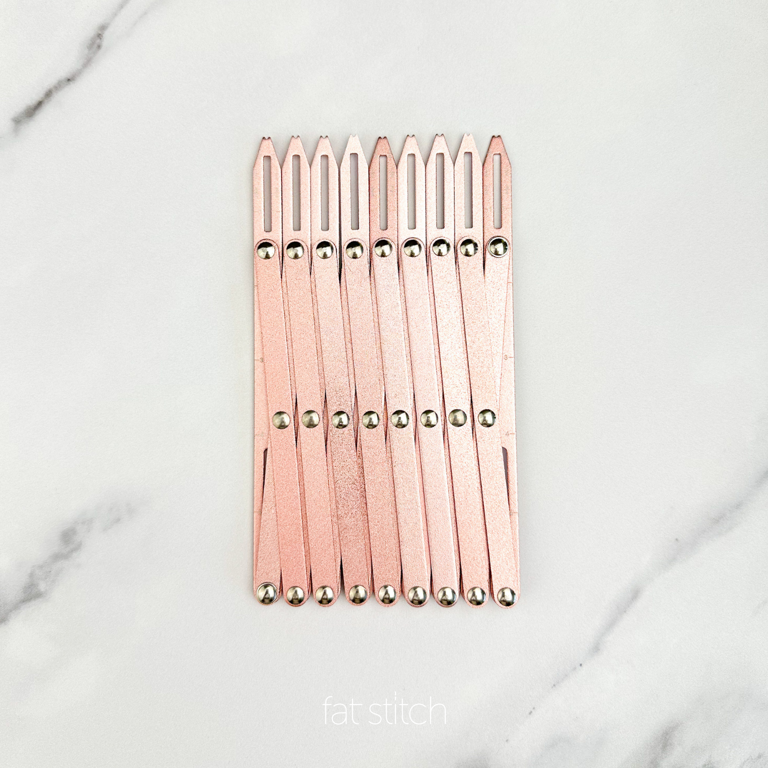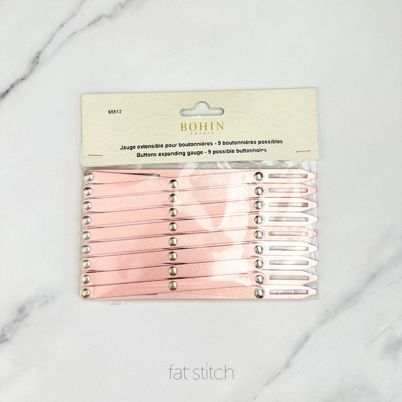 -6%This beautiful metal buttonhole measuring gauge is a must have in the sewing toolbox. This makes measuring equal spacing for buttons and quilt planning a breeze. Simply expand and contract the gauge to your desired button spacing and mark where you want the buttonhole to go on your fabric. This pink version is a Fat Stitch favorite and can mark up to 9 buttons at a time.